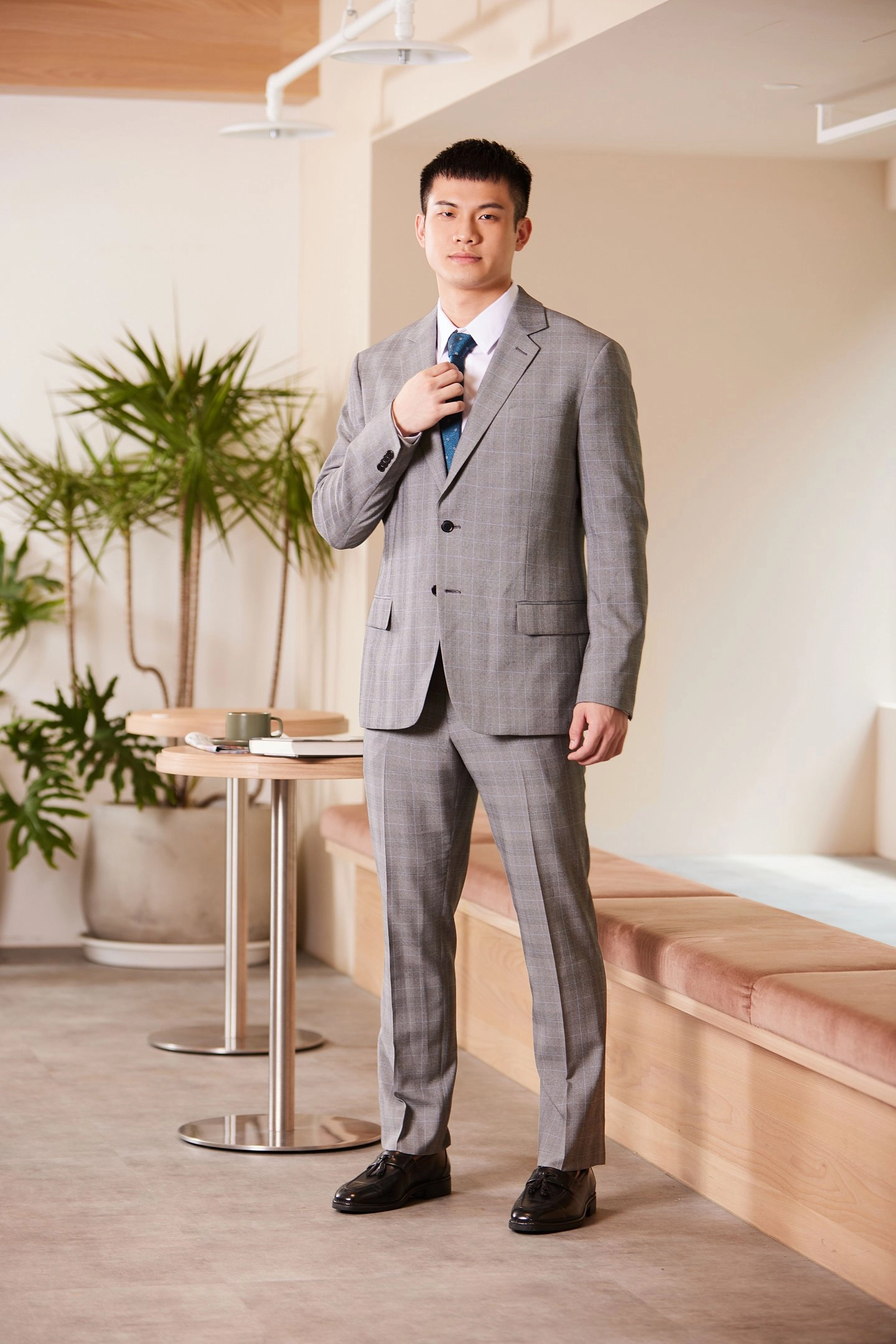 新職裝系列包含黑、灰、藍等沉穩色彩,以嘉裕獨家剪裁工藝,打造出修身輪廓,運用雙釦設計展現年輕活力。菱形領片的平駁領款式,具多元搭配性,適合職場、日常休閒,甚至婚禮場合。提供素面與格紋等面料選擇,滿足不同時尚品味,可與皮鞋或小白鞋配搭,轉換正式與Smart Casual等風格。其中,深藍素面的新職裝具備些微彈性,更舒適好活動,內斂的色調,能完美烘托專業性,予人可信賴的第一印象;純黑與深藍底色搭配格紋設計,低調隱約的獨特質感,為個人增添俐落鮮明的特色;色彩豐富明亮的淺灰格紋,彰顯紳士般的優雅氣質,讓社會新鮮人突顯能見度,展現自信風采。