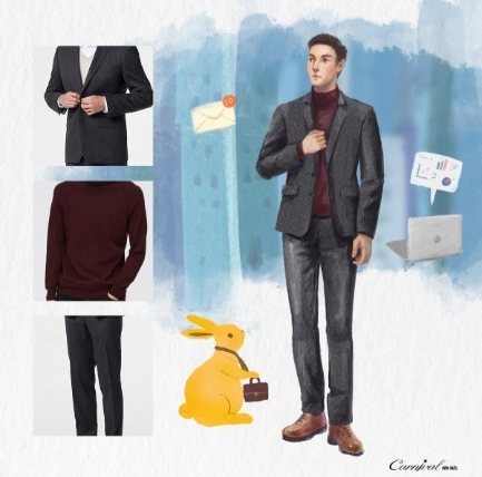 年後開工第一天,以容光煥發的姿態,氣勢滿滿回歸職場,帶來工作順利、步步高升好彩頭。Smart Casual微正式西裝是開工上班的最佳選擇,Carnival嘉裕灰色組織紋西裝,獨特剪裁穿起來英挺有型,單排兩釦與單開岔的簡約設計,展現職場俐落風格。100%純羊毛面料,柔順透氣,光澤感彰顯出優雅質感。裡面配搭高領針織衫取代襯衫與領帶,讓開工造型具正式感卻不會過於嚴肅。高領針織衫採無側縫3D立體剪裁,能修飾身形,充滿喜氣的酒紅色,呼應鴻運當頭的新年美好寓意。