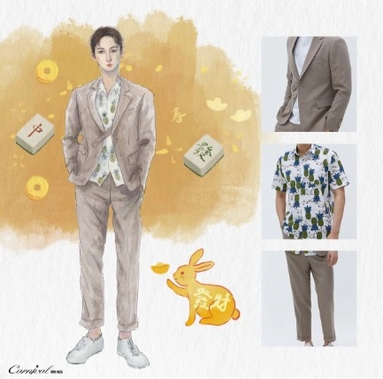 在闔家團圓的除夕夜,換上亮色系服裝,讓造型更有活力,迎接來年好運勢。米色、淺棕在明亮氛圍中也能彰顯沉穩氣質,為質感型男的節慶服裝色彩首選。Carnival嘉裕一款寬鬆版雙釦設計休閒外套,採用柔和的米褐色調,獨家設計可拆式絆帶,細節具有巧思,讓風格更多變;搭襯微窄管九分反褶褲口休閒褲,腰部的活褶設計具修飾身形效果,能隨興穿出個性感。裡面特別配搭上鳳梨印花圖騰襯衫,既符合熱鬧歡樂氛圍,更象徵新年運勢旺旺來,為年節最應景的必備單品。