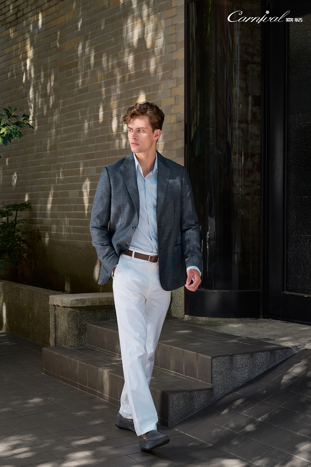 100% 羊毛的休閒西裝,以無結構、無裡布設計帶出自然垂墜感,宛如第二層肌膚般輕盈。與白色長褲搭配,捕捉了午後的都會氣息。這不是刻意的造型,而是習慣優雅的結果。可搭配白襯衫或細條紋襯衫,營造清爽層次。若想再休閒些,可換上米色或海軍藍針織 T。最後加一副墨鏡,真正的放鬆,是連不經意都剛剛好。