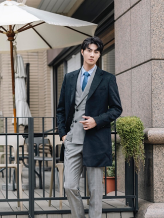 也可選擇英倫風格的正裝套裝,於派對上展現氣場。淺灰格紋羊毛混紡雙排釦成套西裝經典復古,綻放優雅貴族氣質。面料呈現獨特光澤感,在沉鬱冬季中顯得活力耀眼。外面與英倫風西裝領長版大衣配搭,可拉長身形又增添氣勢,材質為98% Cashmere喀什米爾羊毛,觸感細膩柔軟。搭襯藍色緹花領帶,精緻的花色細節成為整體造型亮點。